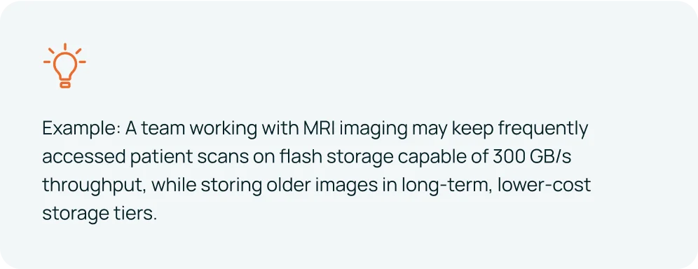 - AI-optimized storage: Architectures like VAST and WEKA tuned for multi-petabyte datasets and high-throughput access patterns common in sequencing and imaging.
